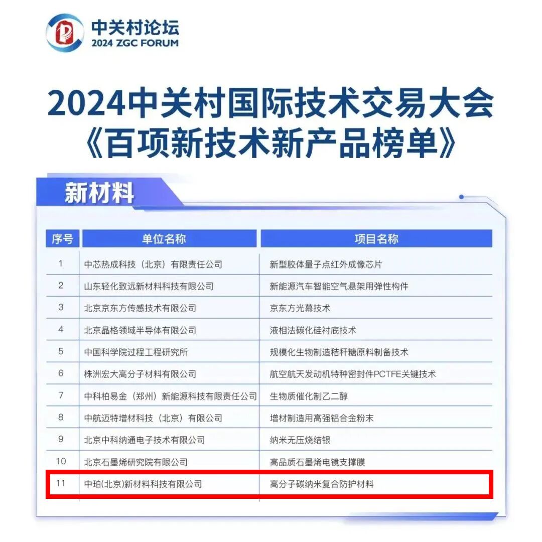 2024年4月,中关村国际技术交易大会开幕式暨全球技术交易生态伙伴大会正式发布“2024《百项新技术新产品榜单》”,中珀新材“高分子碳纳米复合防护材料”凭借其前沿的研发技术与独特的产品性能,荣登该榜单。
